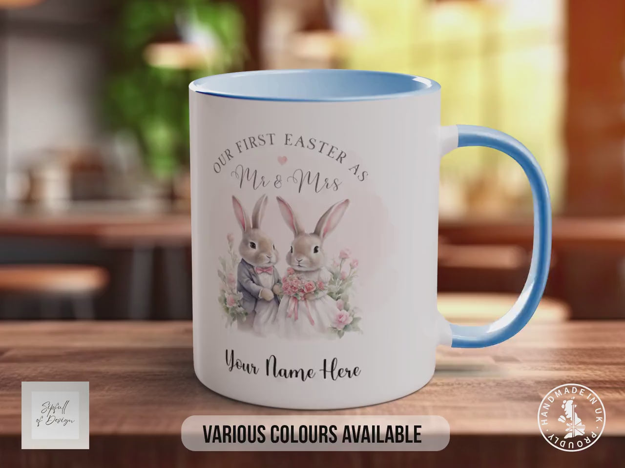 Celebrate your First Easter as Mr & Mrs with this beautifully handmade personalised mug from Sipfull of Design. Crafted from fine bone china and available in 11oz, 10oz, 15oz, and a 12oz latte size, this mug is designed to bring a warm, personal touch to your Easter celebrations. Personalise it with your chosen text and font colour to create a truly unique keepsake that will be cherished for years to come.